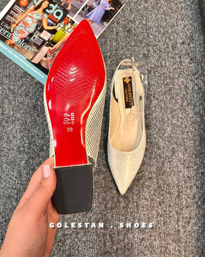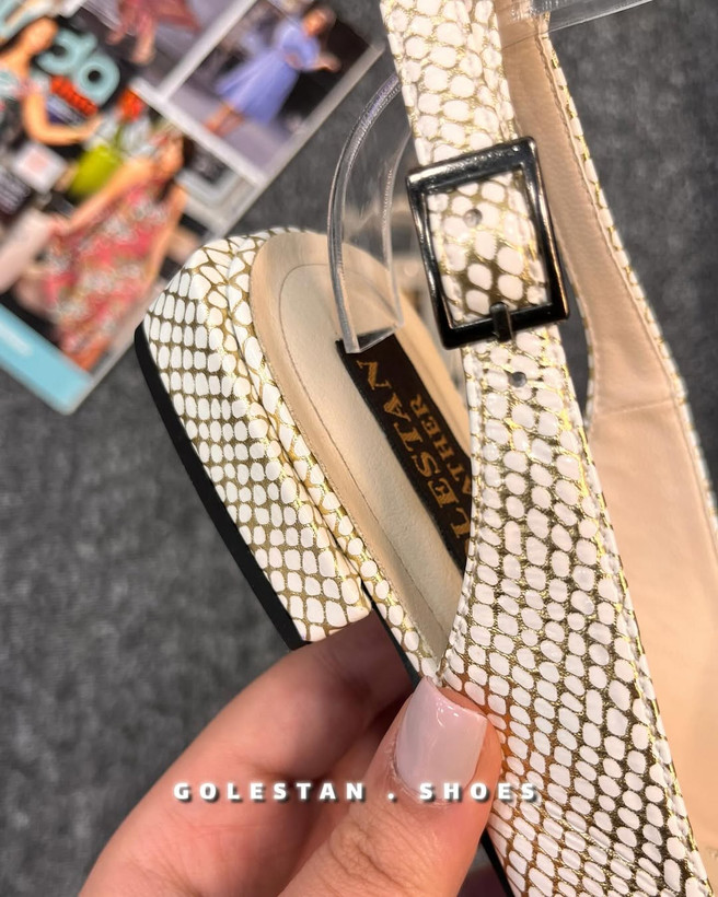 كفش بايد اينجورى ملوس و خاص باشه. سفید باشه، پاشنه یک سانت باشه. رويه:بياله ورنى طرحدار، زيره دافوس ترك، كفى ماهيچه اى، بند قابل تنظيم.